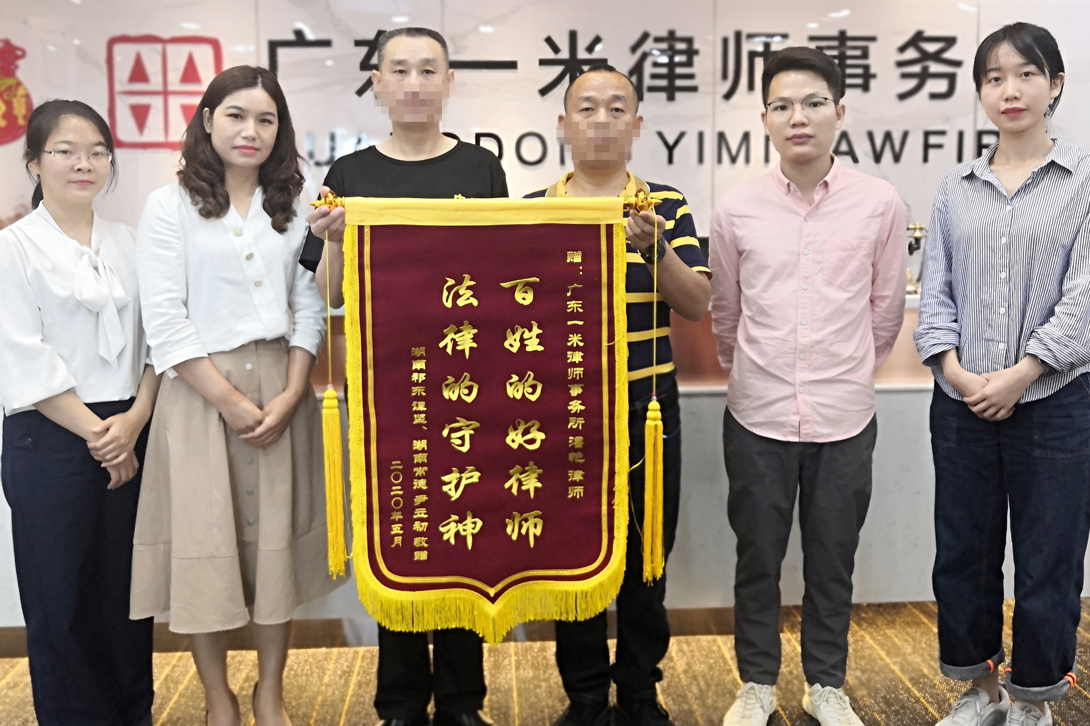 2020年4月29日,谭先生和尹先生来到广东一米律师事务所,将写有“百姓的好律师 法律的守护神”的锦旗交到潘艳律师手上,以表达对广东一米律师事务所团队的真挚感谢。