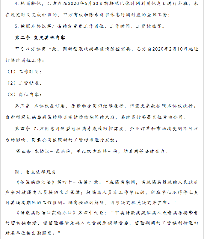 (4)其他协商处理 企业因受疫情影响导致生产经营困难的,可以通过与职工协商一致采取调整薪酬、轮岗轮休、缩短工时、待岗等方式稳定工作岗位,尽量不裁员或者少裁员。鼓励受疫情影响的企业采取集中工作、集中休息方式保持正常生产经营。符合条件的企业,可按规定享受稳岗补贴(稳岗补贴后续实时跟踪人社保障部门规定据实申请)。受疫情影响的企业,符合规定条件的,可以按照生产经营需要,申请执行综合计算工时制度,实行集中工作、集中休息方式保持正常生产经营。关于缩短工作时间,调整薪酬,轮岗轮休等建议按照企业实际情况,与员工协商一致,在员工书面同意的前提下,企业应当留存与职工协商一致的证据(该期间工资是否支付、如何计算),按照协商后的工作时间和工资标准据实支付。轮岗轮休的情况下,应该同时通知员工补班的时间等。 (协商协议书模板详见附件,仅供参考,企业根据实际情况据实采用)。