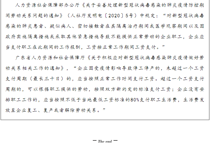 (三)企业停工停产规定 广东省人力资源和社会保障厅《关于积极应对新型冠状病毒感染肺炎疫情做好劳动关系相关工作的通知》,企业因受疫情影响导致停工停产的,未超过一个工资支付周期(最长三十日)的,应当按照正常工作时间支付工资。 超过一个工资支付周期的,可以根据职工提供的劳动,按照双方新约定的标准支付工资;企业没有安排职工工作的,应当按照不低于当地最低工资标准的80%支付职工生活费,生活费发放至企业复工、复产或者解除劳动关系。 如果停工超出合理期限或者约定期限,劳动者可以单方依据我国《劳动合同法》第三十八条第一款第一项的规定提出解除劳动合同并主张相应的经济补偿金。